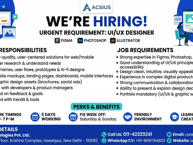Company: ACSIUS Technologies Pvt. Ltd. Location: Hasanpur, New Delhi (In-office) Are you passionate about creating seamless digital experiences? We’re looking for a creative and detail-oriented UI/UX Designer to join our growing team! Key Roles & Responsibilities . User-Centered Design: Craft high-quality UI/UX solutions for web and mobile applications . Research & Strategy: Conduct user research to identify pain points and improve user flows . Prototyping: Build wireframes, user flows, and interactive prototypes . Interface Design: Create stunning designs for websites, dashboards, and mobile apps . Graphic Assets: Design creatives for marketing, social media, and branding . Collaboration: Work clo...